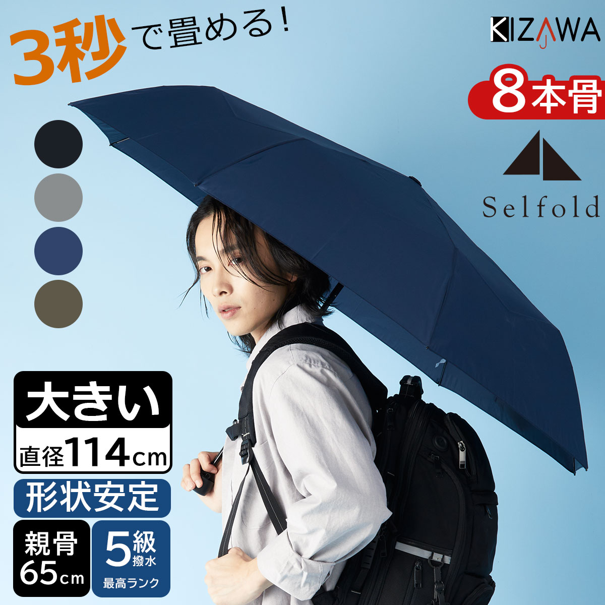 3秒で畳める 雨傘 形状安定 折りたたみ傘 大きい 8本骨 直径114cm Selfold~wisp+~