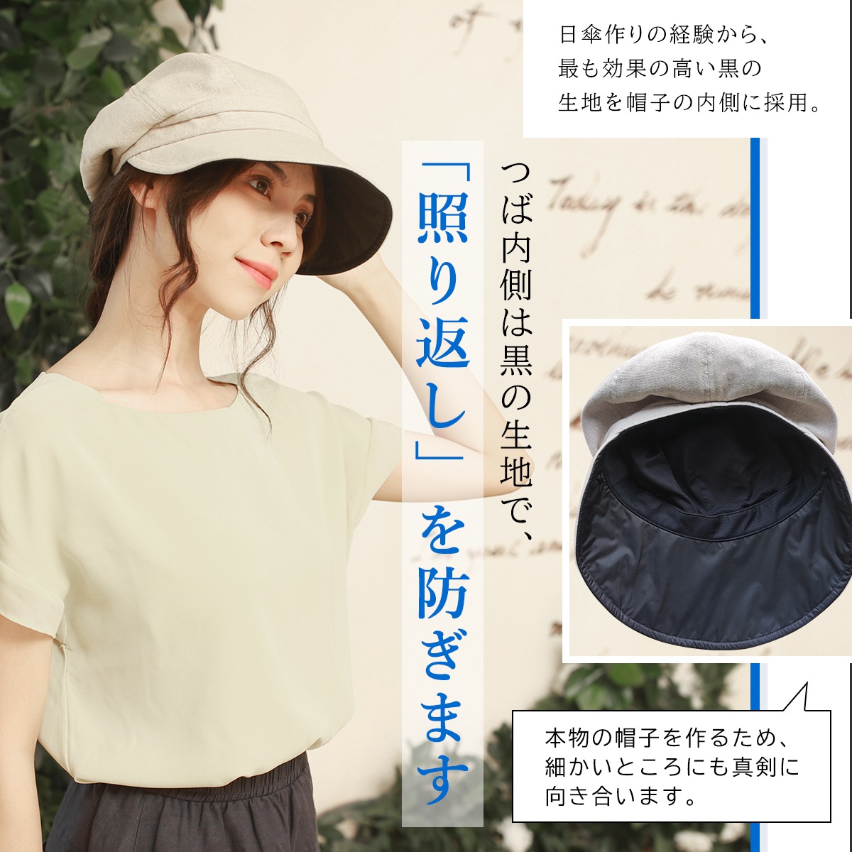 帽子のつば部分の中には弊社完全遮光日傘生地と同じ素材(※)を使用しております。日傘が使えない時に、被るだけで簡単に紫外線対策!