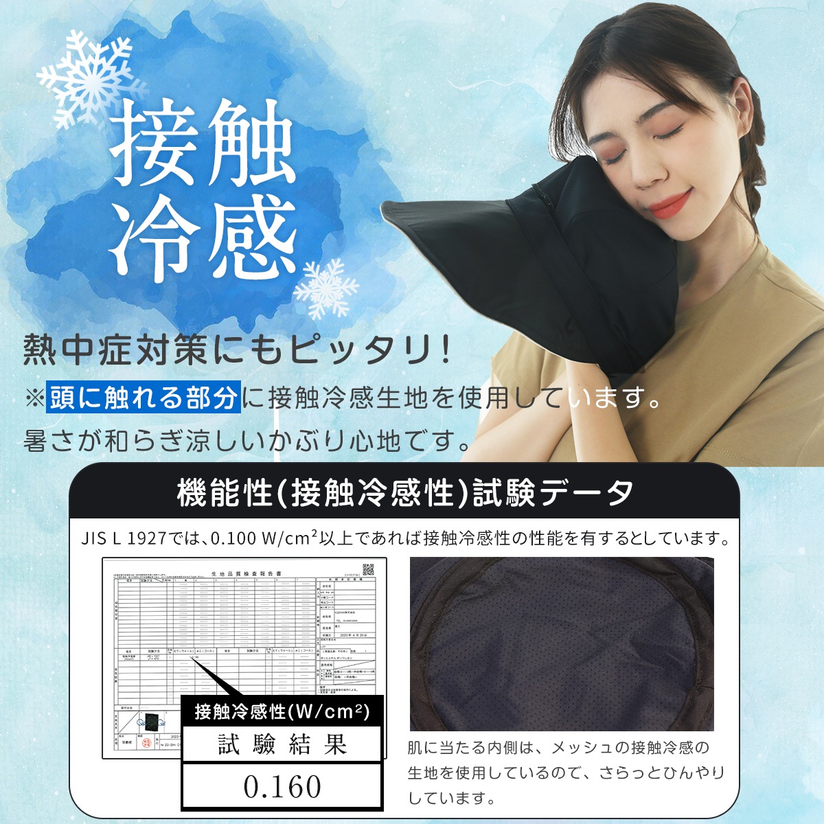 頭に触れる部分に、ひんやり気持ちいい接触冷感生地を使用しています。暑さが和らぎ涼しいかぶり心地です。