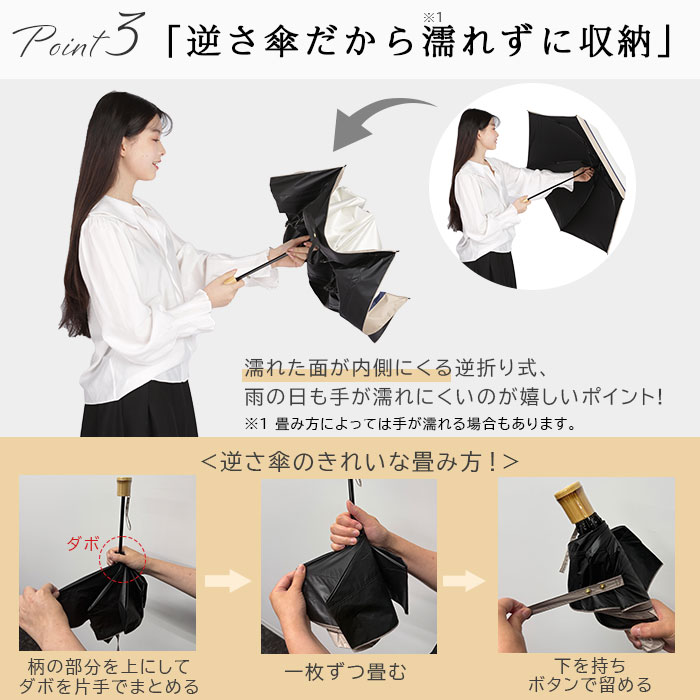逆さ傘は濡れた部分が内側になる仕様です!閉じる際に手が濡れにくく、人混みや電車の中でも、周りが濡れないように気を遣う必要がないこと。 衣服・荷物・車のシートなどを濡らしたくない時にオススメです。