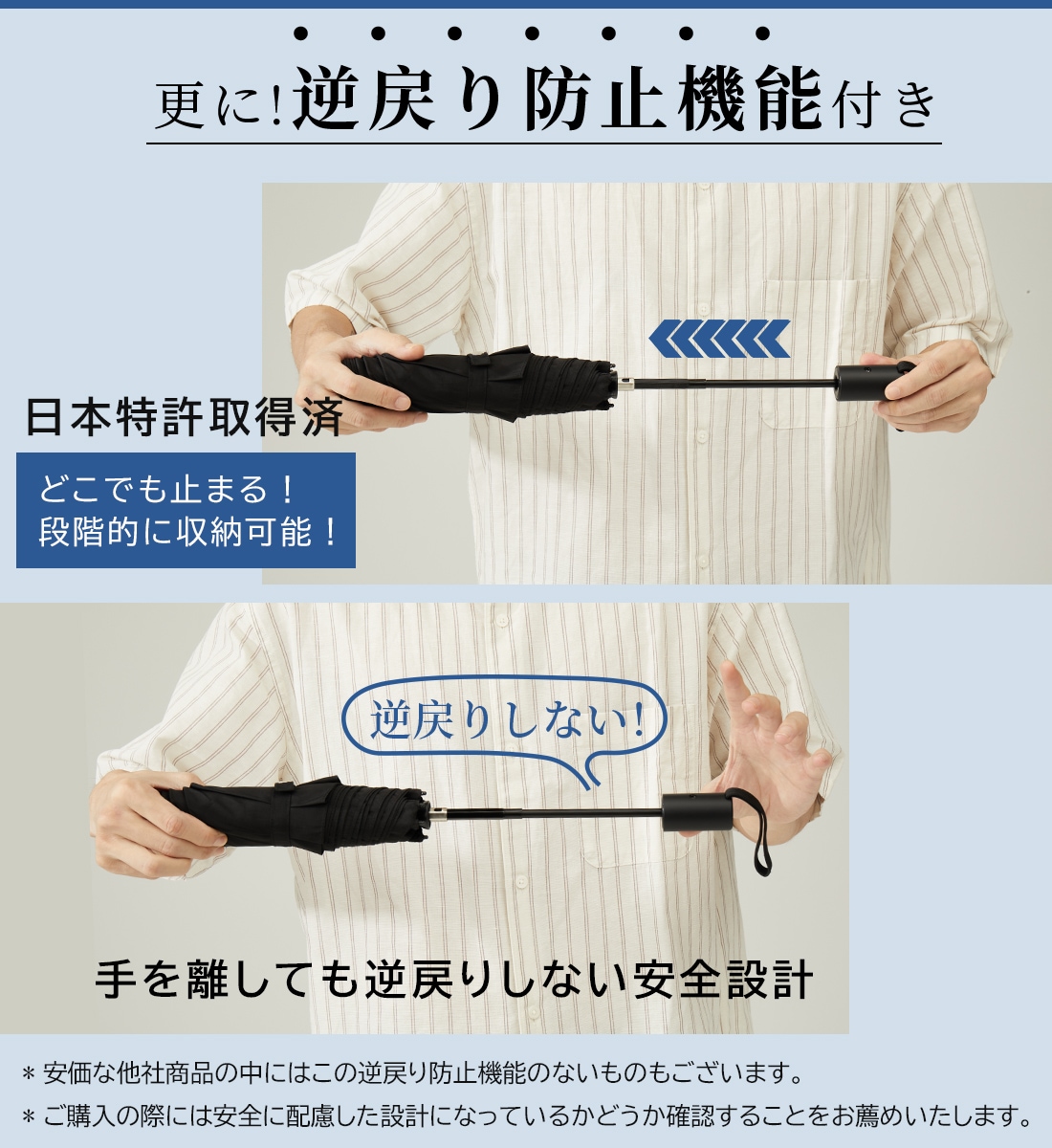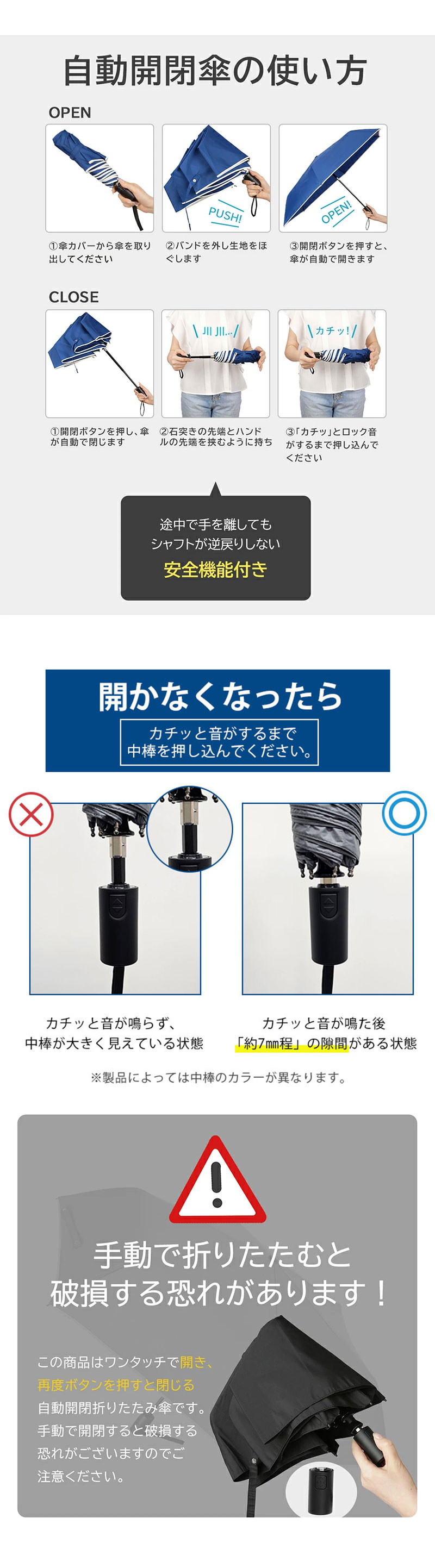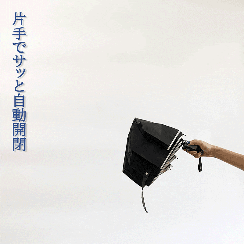 柄を元に戻す際の不意な飛び出しを防ぐセーフティシャフト(日本特許取得済)搭載で、一般的な自動開閉折りたたみ傘より安全に閉じられます。途中で手を放しても安全!