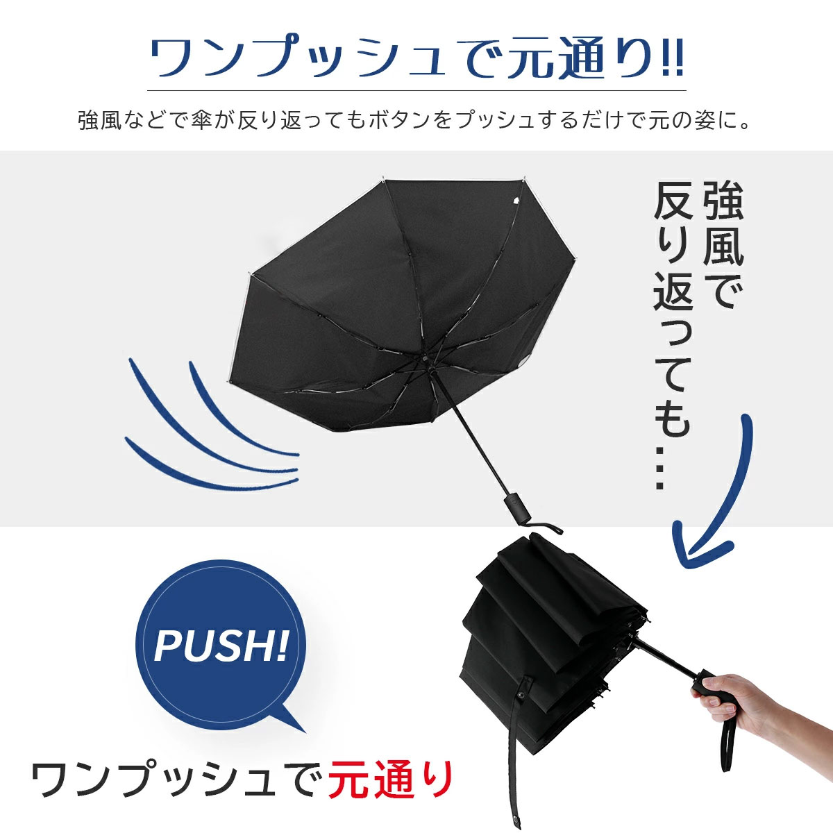 軽量でありながら丈夫で折れにくいので、強風などで傘が反り返っても傘を閉じれば元に戻ります。