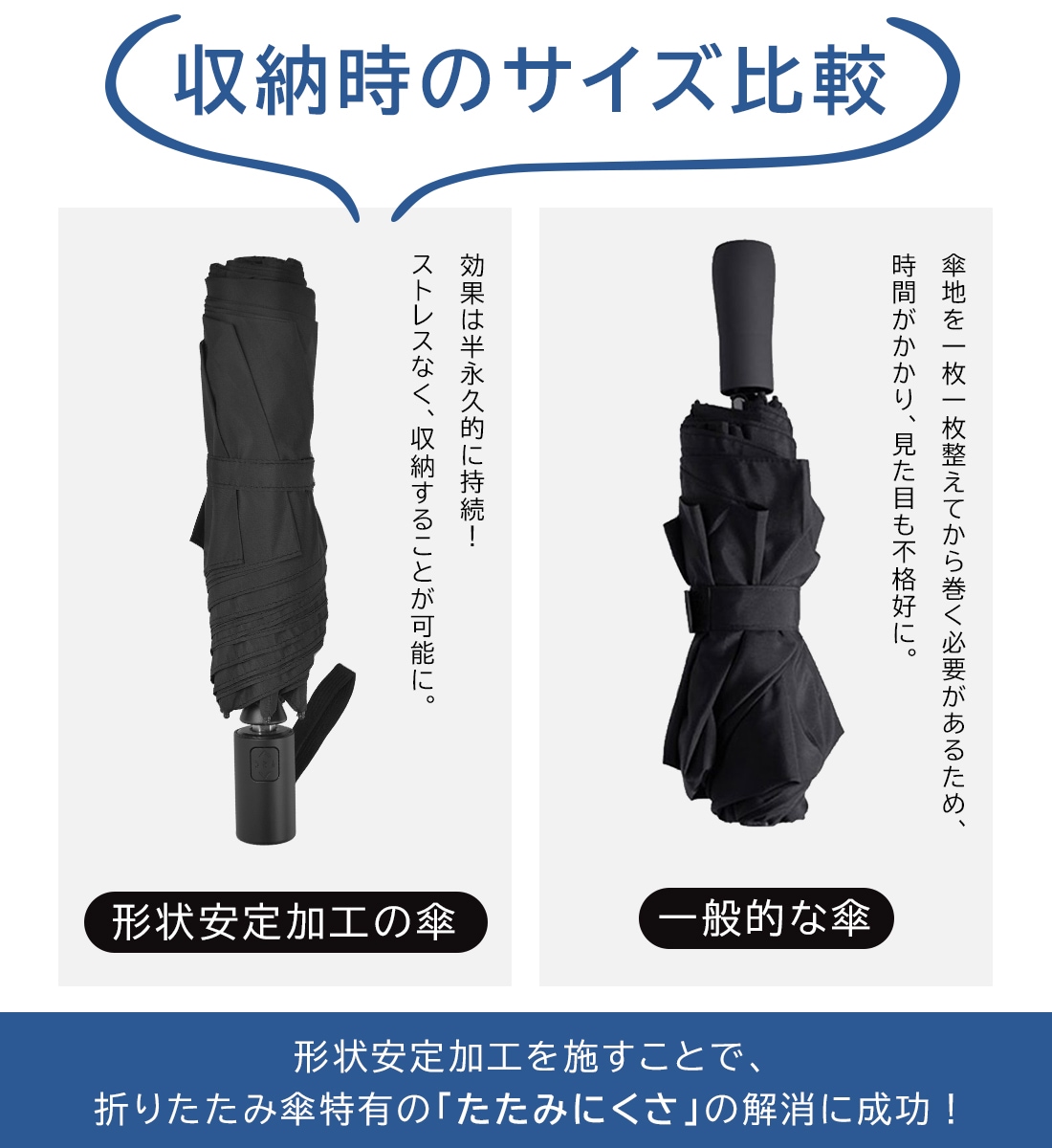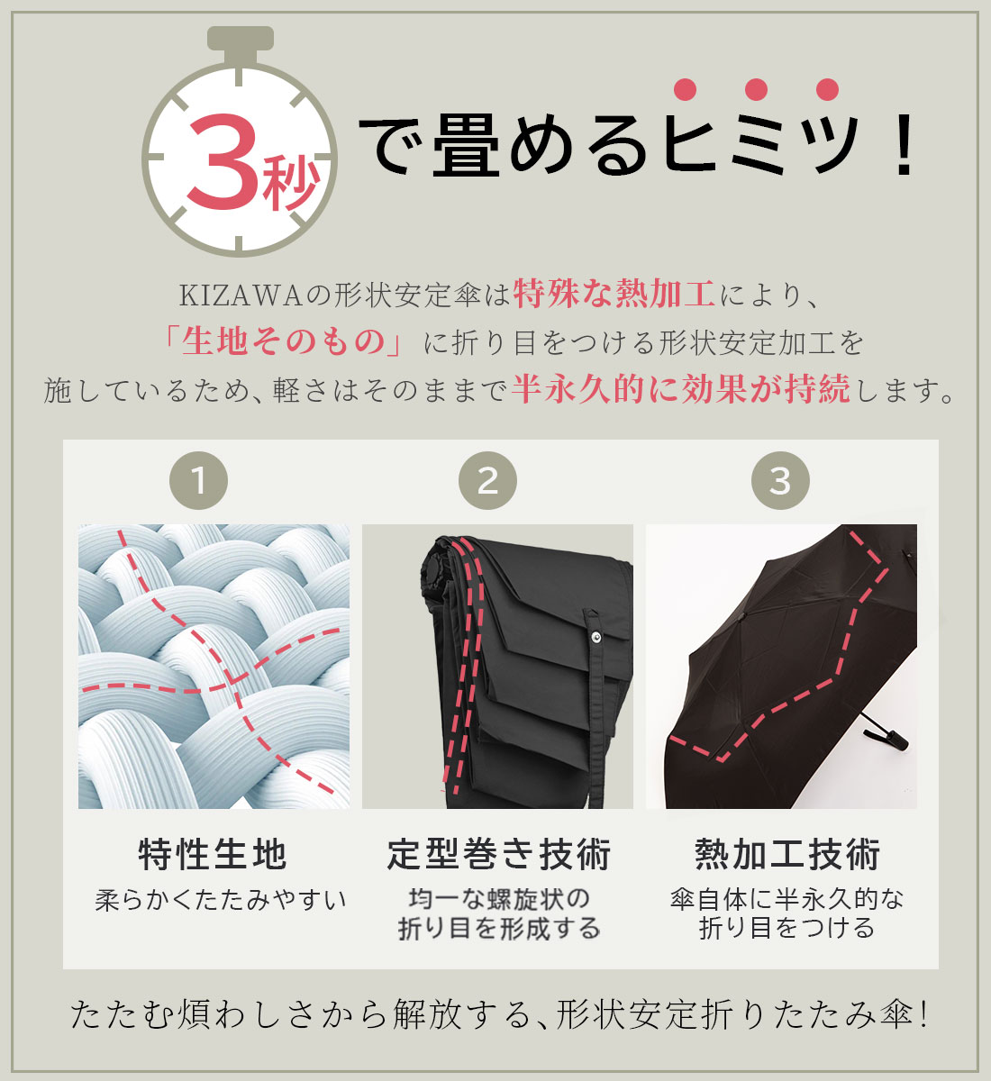 一般的な形状安定傘は、傘地にシートを貼り付けて作るため、重さが気になったり、使用している中で剥がれてきたり、骨に負担がかかったりする問題点があります。一方でKIZAWAの形状安定傘は特殊な熱加工により、「生地そのもの」に折り目をつける加工を施しているため、軽さはそのままで、半永久的に効果が持続します。