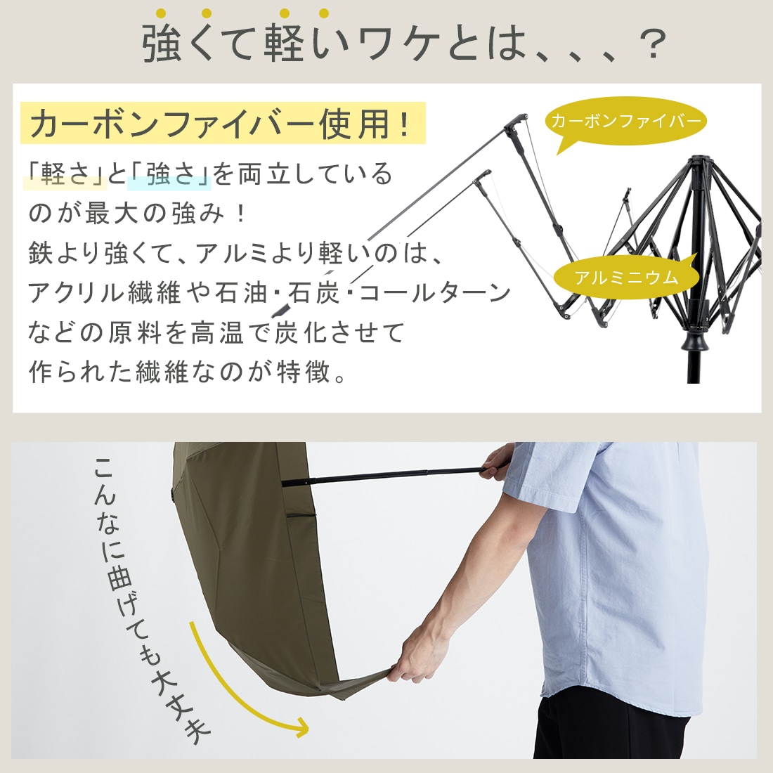 【カーボン傘で耐久性と軽さを両立】