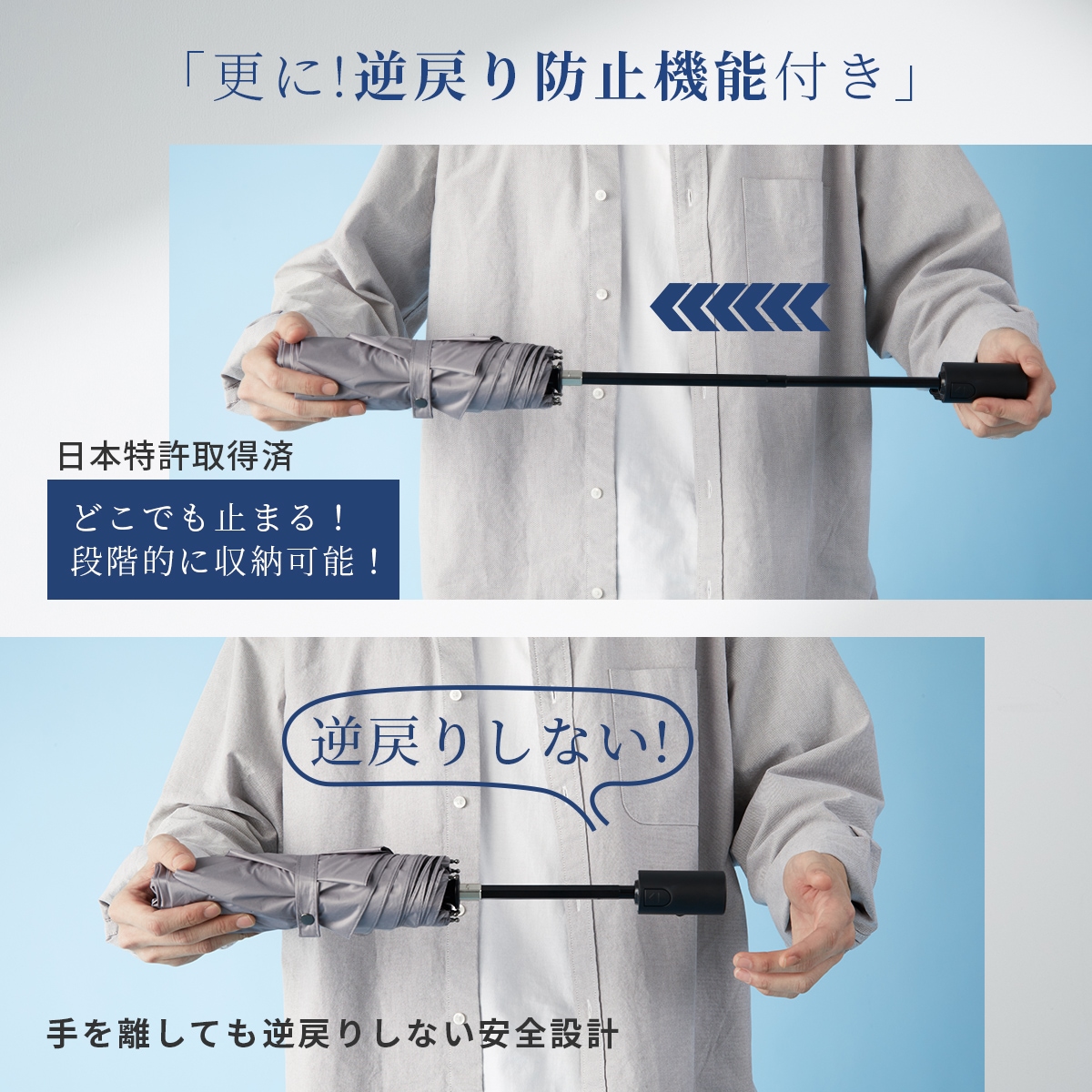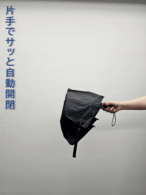 柄を元に戻す際の不意な飛び出しを防ぐセーフティシャフト(日本特許取得済)搭載で、一般的な自動開閉折りたたみ傘より安全に閉じられます。途中で手を放しても安全!