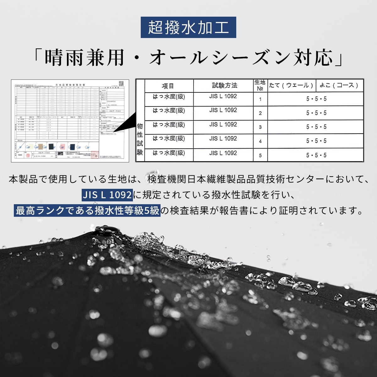 最高ランクの撥水性を誇るポリエステル繊維生地は、軽量・丈夫でありながら優れた撥水性能を持ち、晴雨兼用でご利用いただけます。