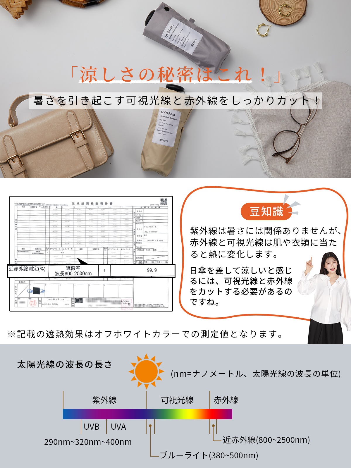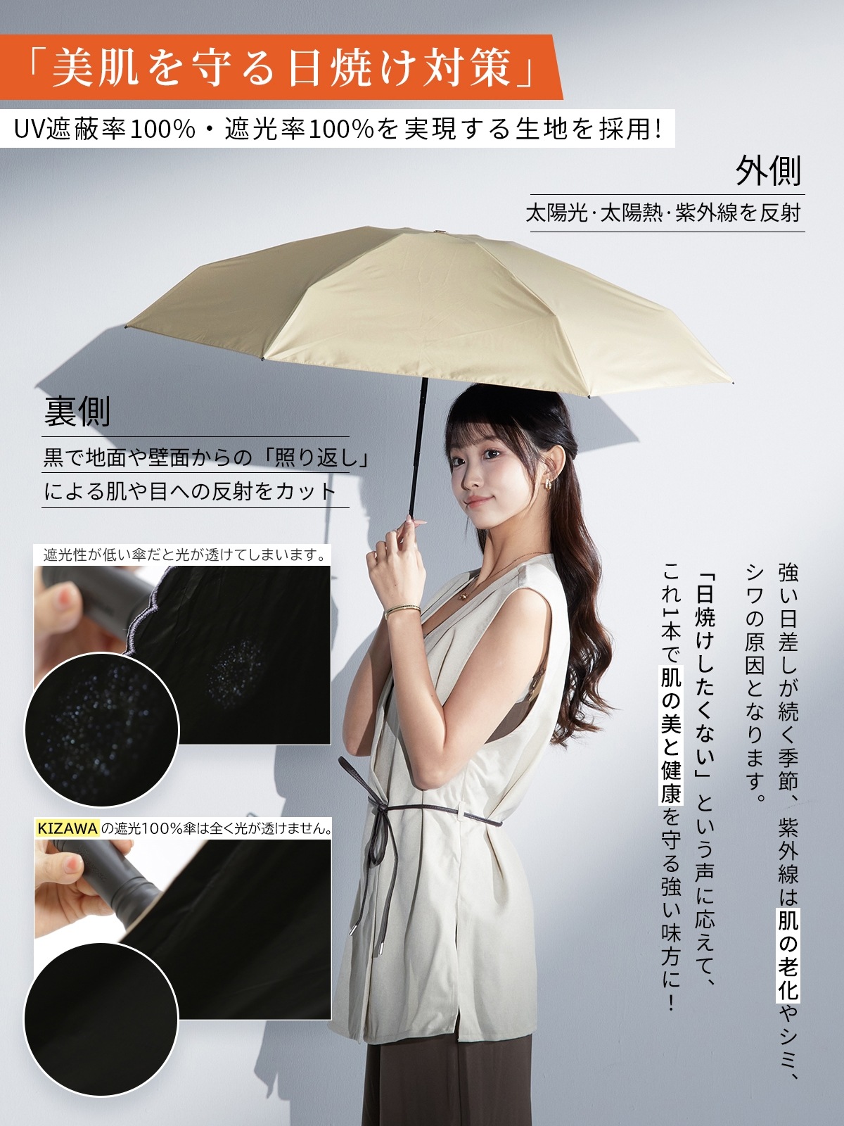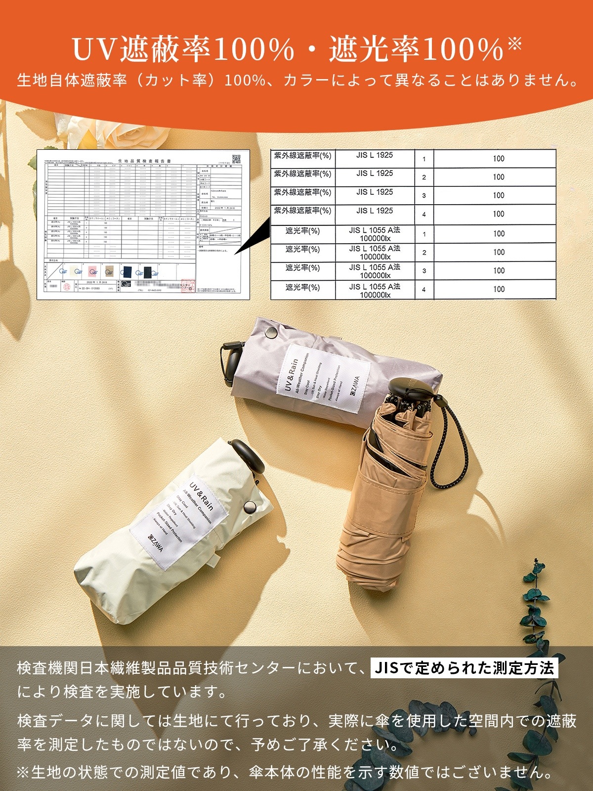 日本繊維製品品質技術センターにおいて「遮光率100%」「UVカット率100%」「UPF50+」「遮熱効果」と証明された最高ランクを誇る高機能な生地を使用した完全遮光の日傘です。