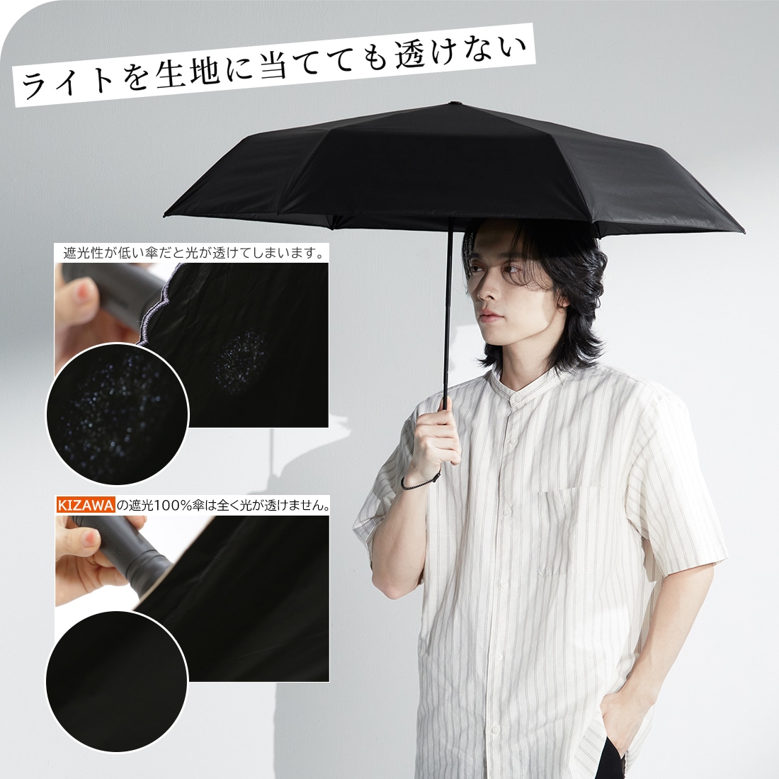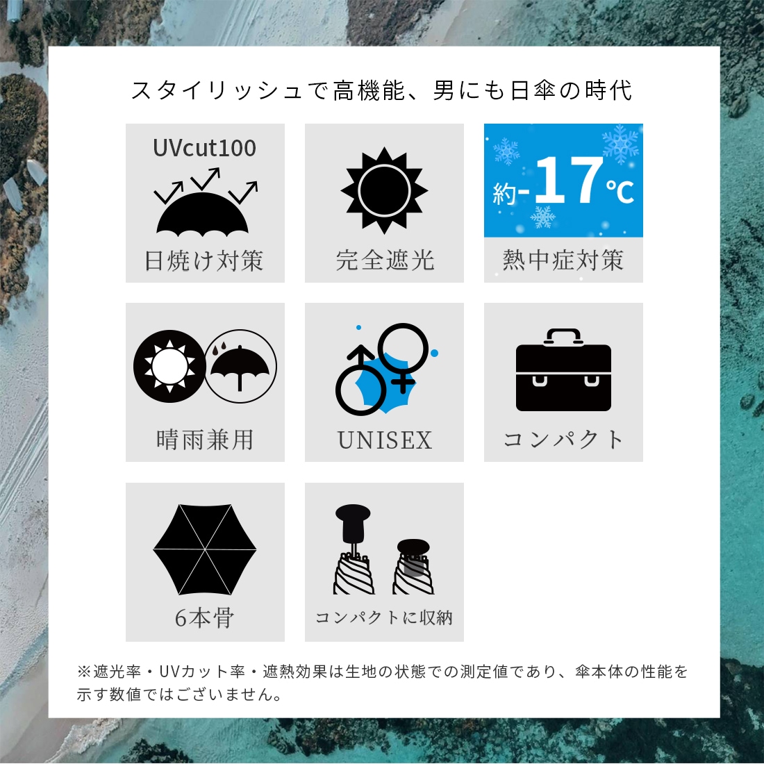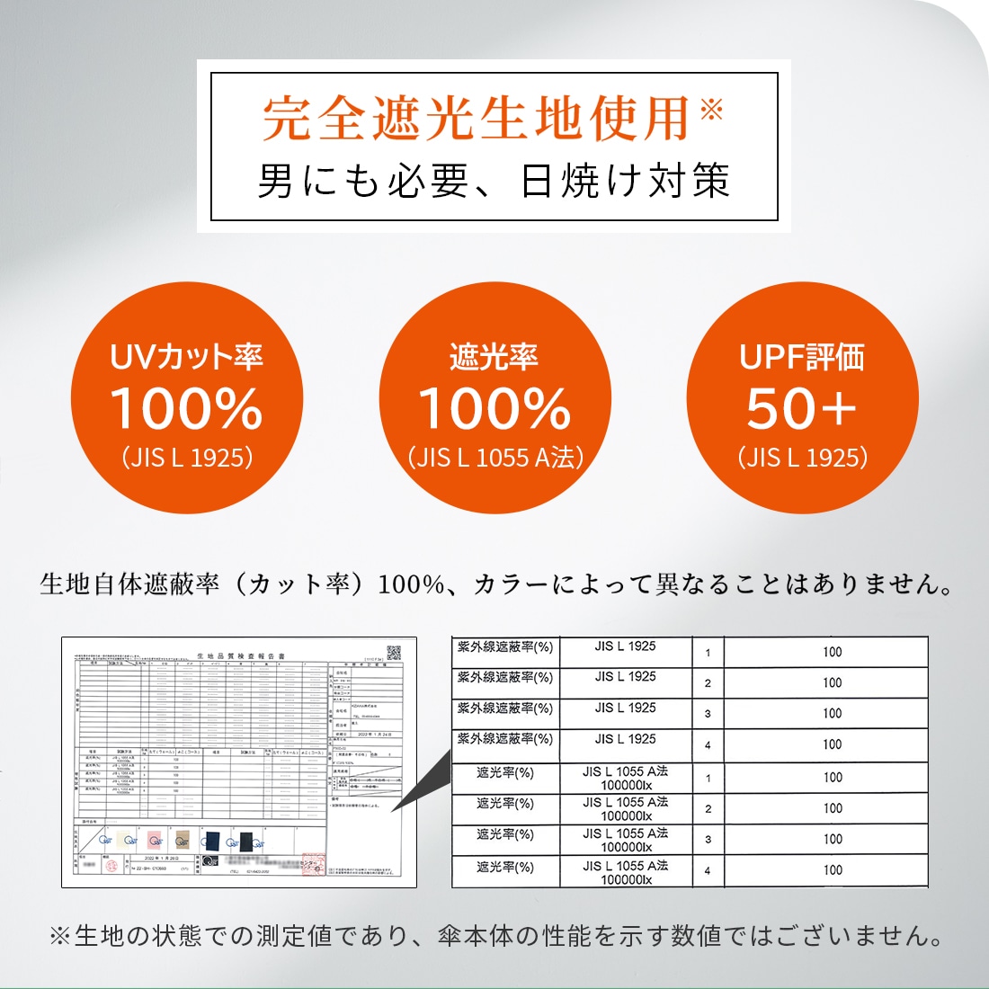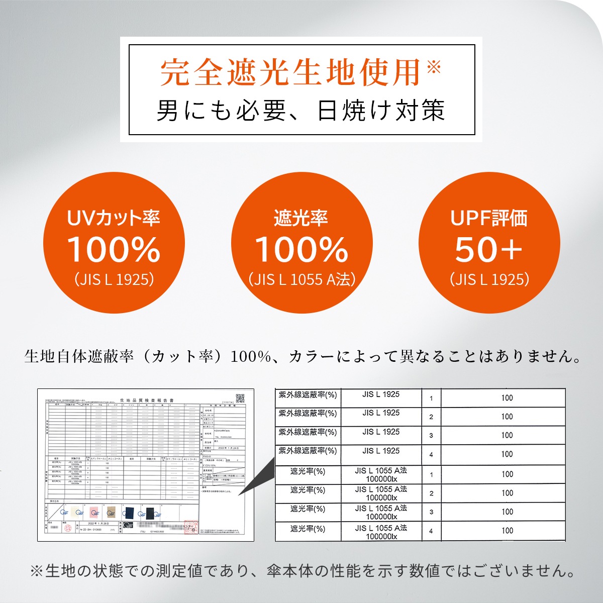 日本繊維製品品質技術センターにおいて「遮光率100%」「UVカット率100%」「UPF50+」「遮熱効果」と証明された最高ランクを誇る高機能な生地を使用した完全遮光の日傘です。