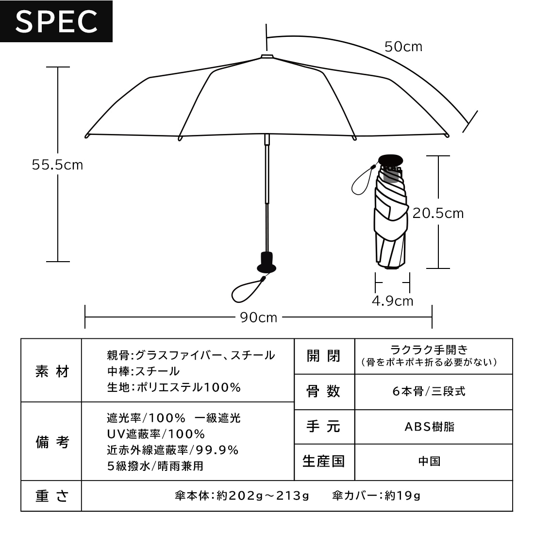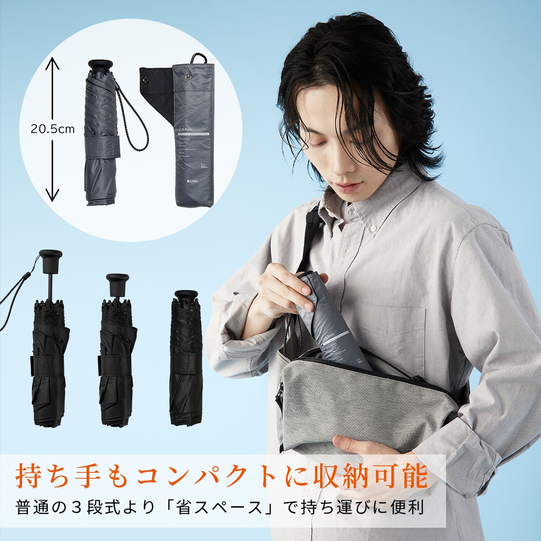 折りたたむ時の長さは20.5cm。カバンに入れて携帯できるスリムサイズで急な雨に降られても安心です。