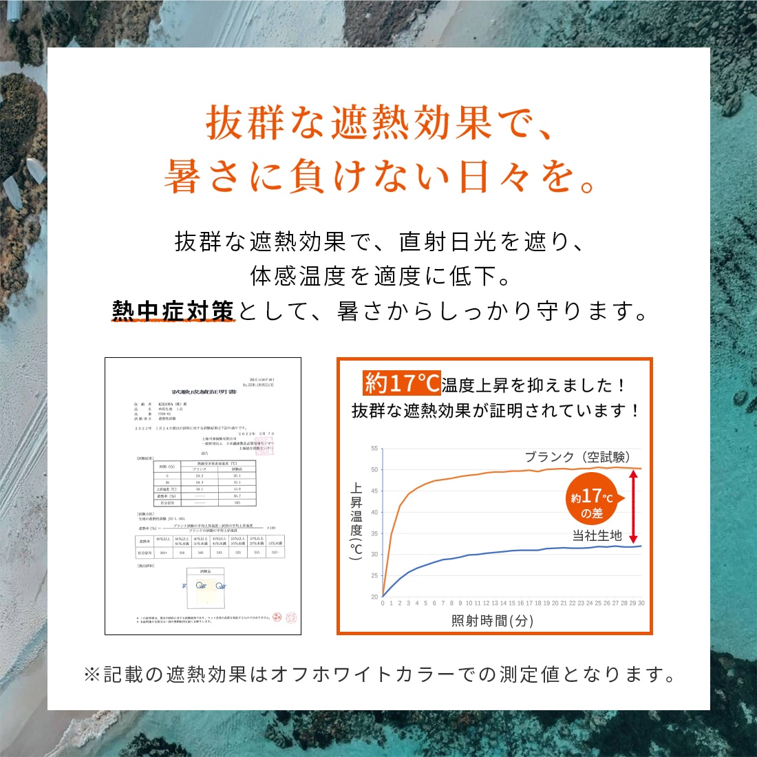 約17℃の温度上昇を抑えた遮熱効果は、木陰にいるような涼しさで外出も楽しくなります!