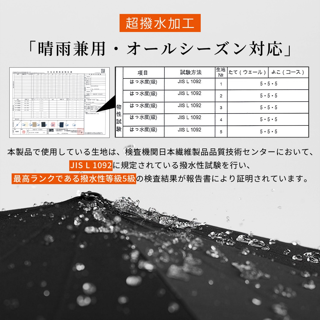 最高ランクの撥水性を誇るポリエステル繊維生地は、軽量・丈夫でありながら優れた撥水性能を持ち、晴雨兼用でご利用いただけます。