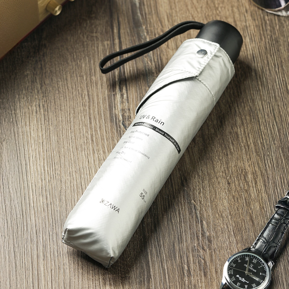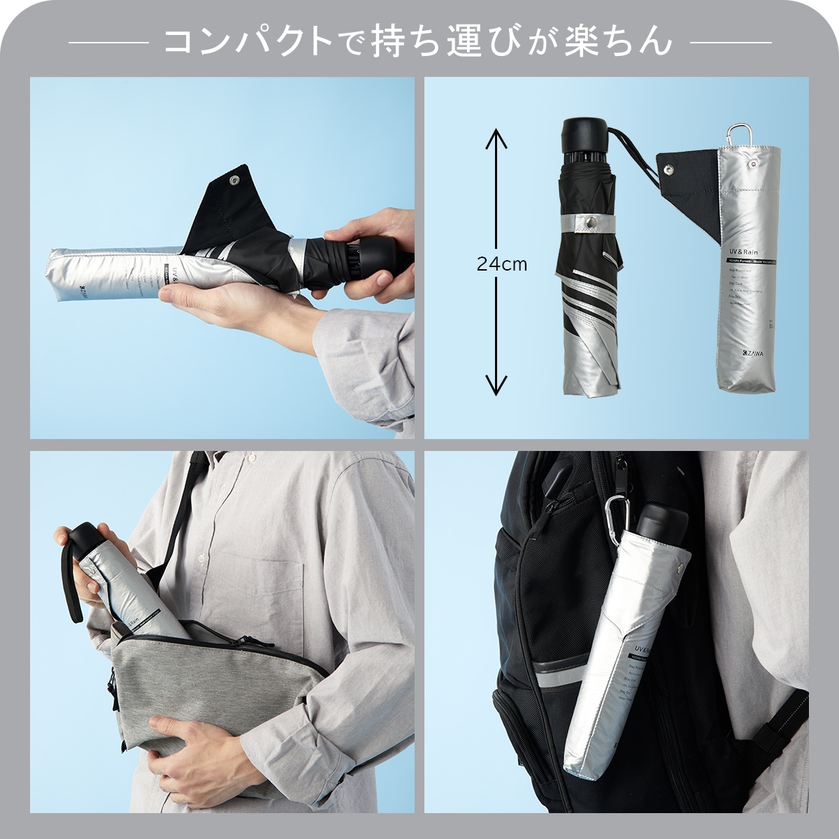 折りたたむ時の長さは24cm。カバンに入れて携帯できるスリムサイズで急な雨に降られても安心です。