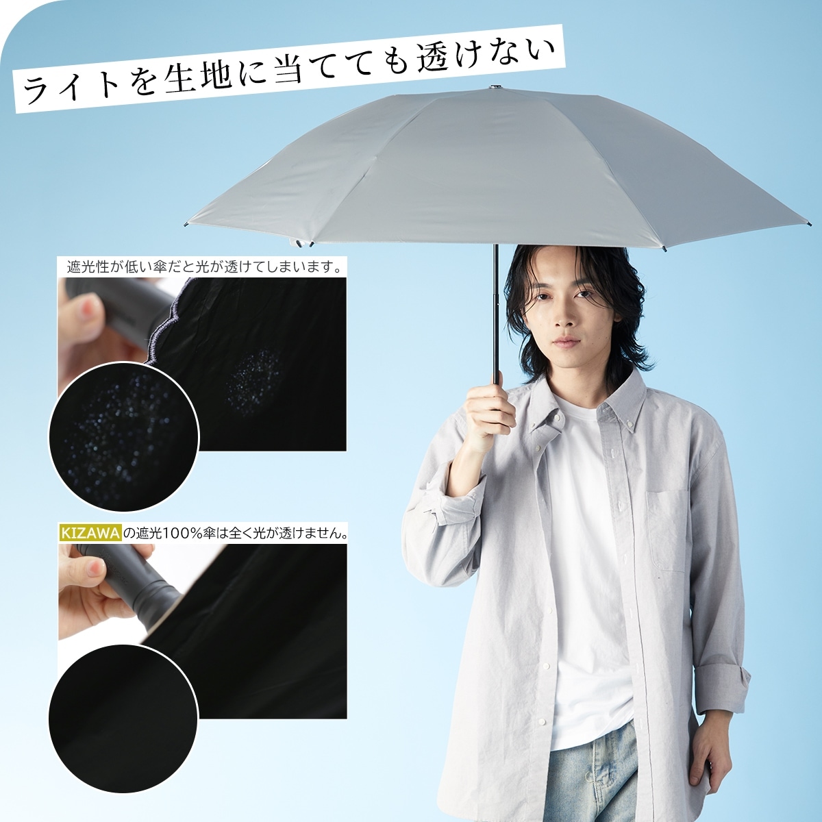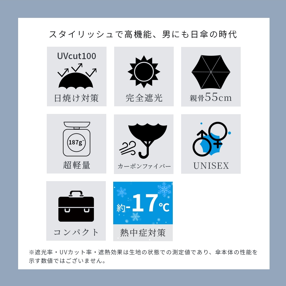 日本繊維製品品質技術センターにおいて「遮光率100%」「UVカット率100%」「UPF50+」「遮熱効果」と証明された最高ランクを誇る高機能な生地を使用した完全遮光の日傘です。