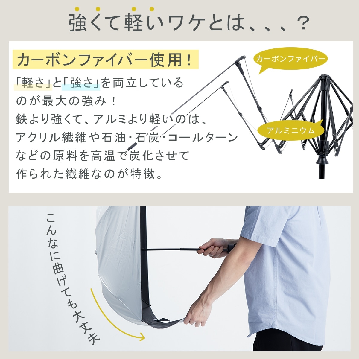 【カーボン傘で耐久性と軽さを両立】