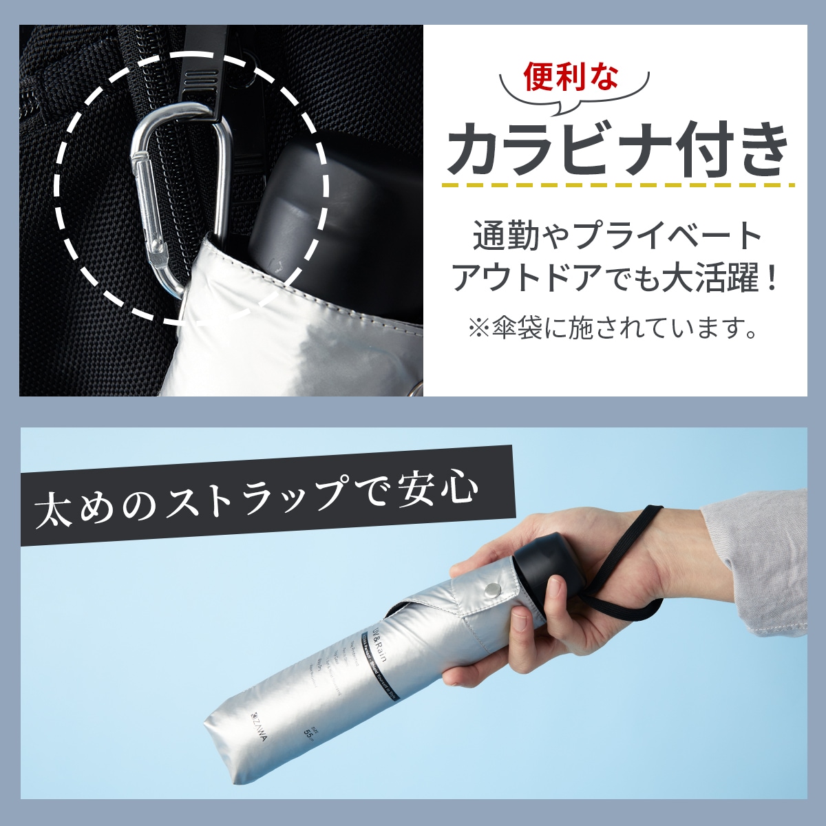 傘カバーにカラビナ付き!サッと引っかけることができるので、通勤・プライベート・アウトドアなどどんなシーンでも使い勝手抜群です。