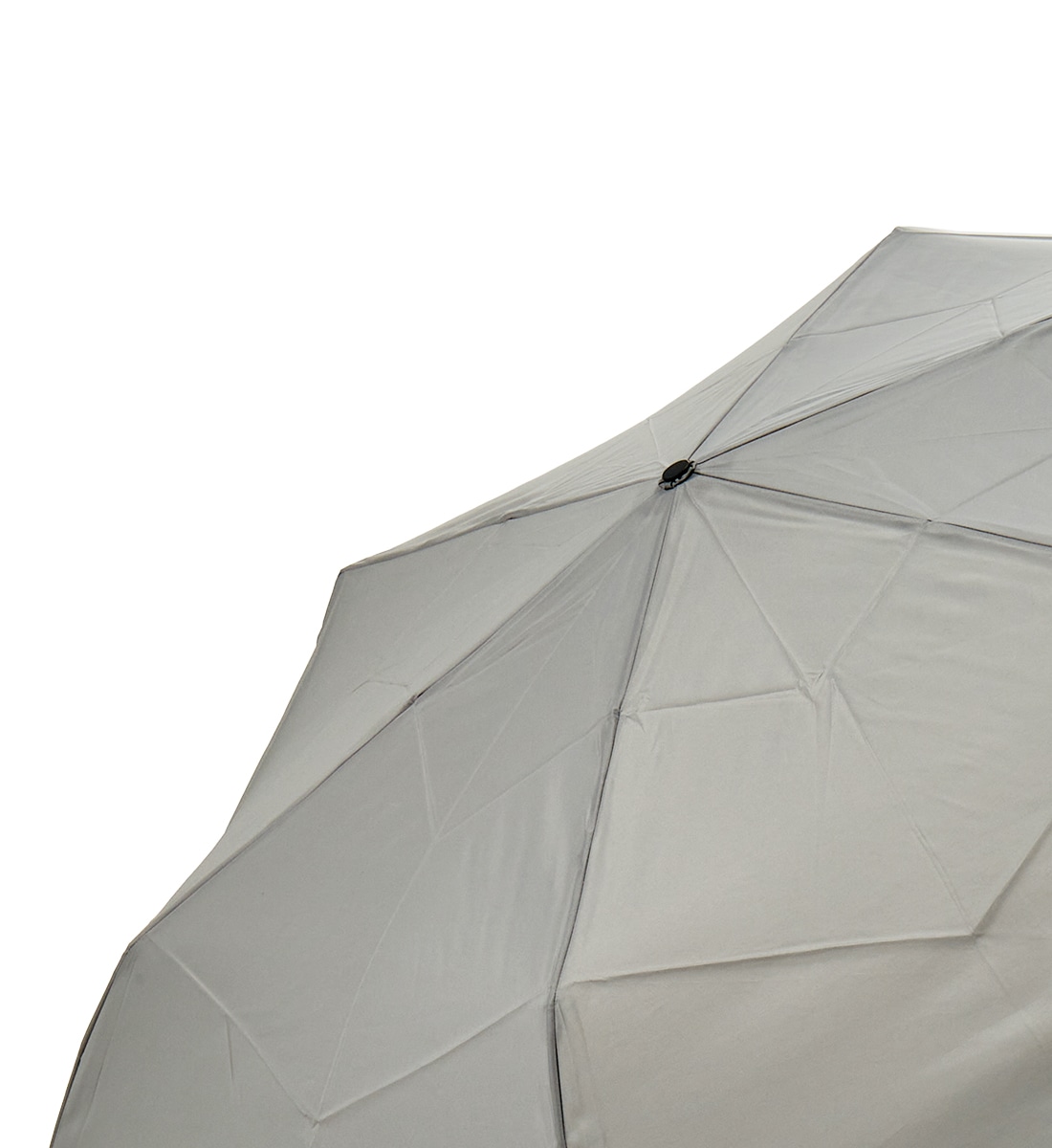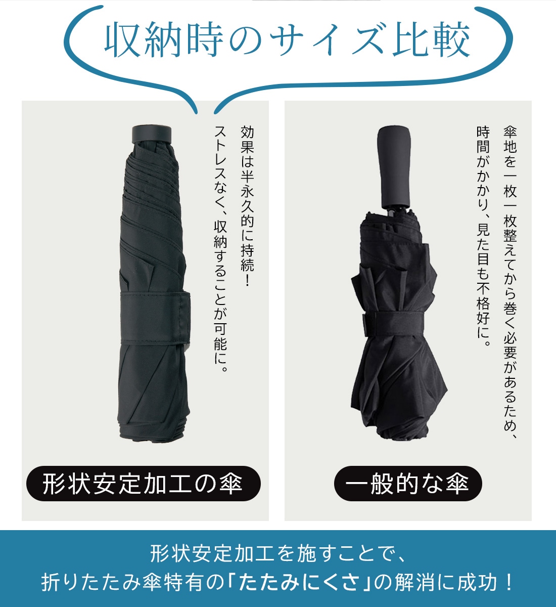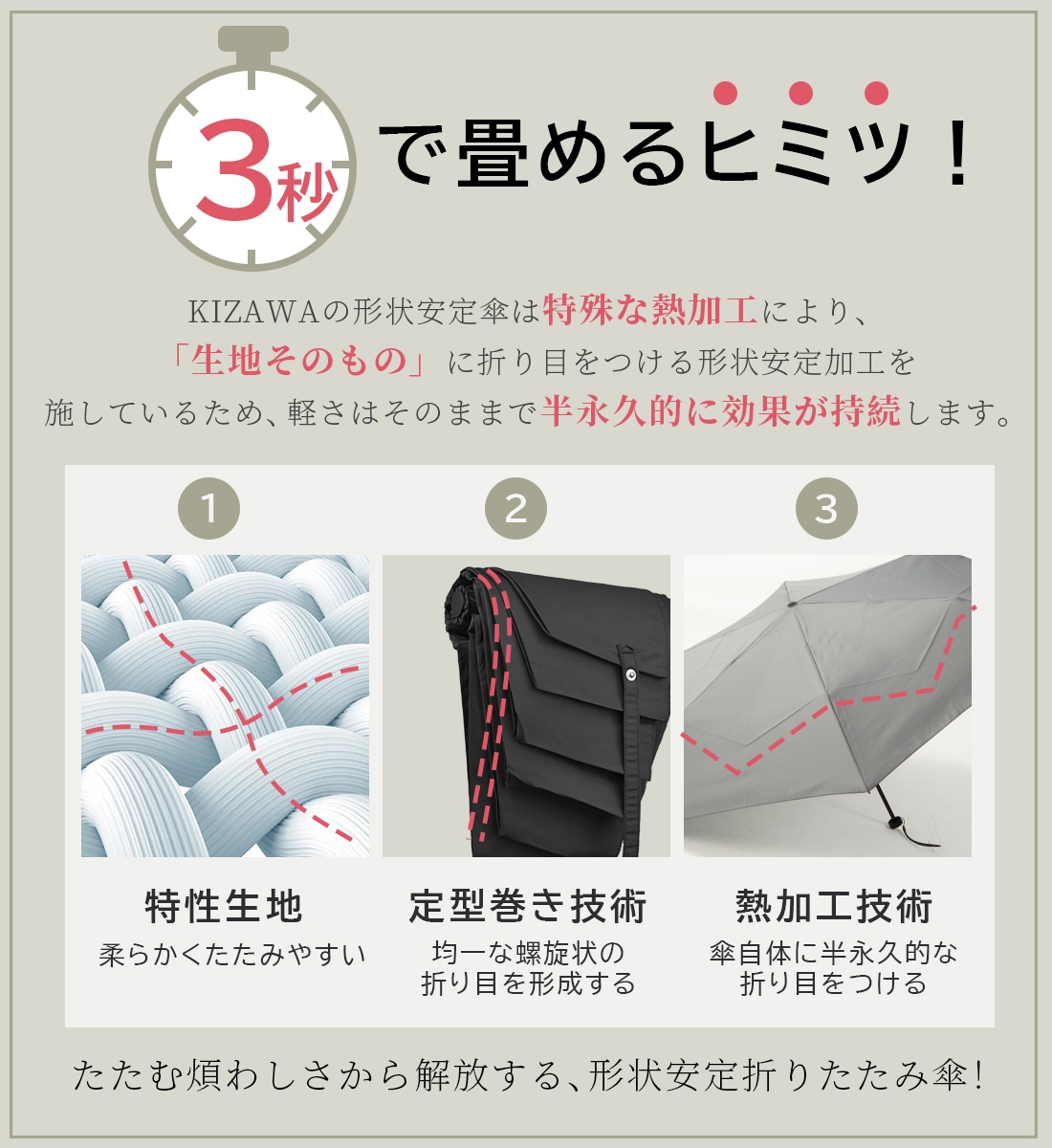 一般的な形状安定傘は、傘地にシートを貼り付けて作るため、重さが気になったり、使用している中で剥がれてきたり、骨に負担がかかったりする問題点があります。一方でKIZAWAの形状安定傘は特殊な熱加工により、「生地そのもの」に折り目をつける加工を施しているため、軽さはそのままで、半永久的に効果が持続します。