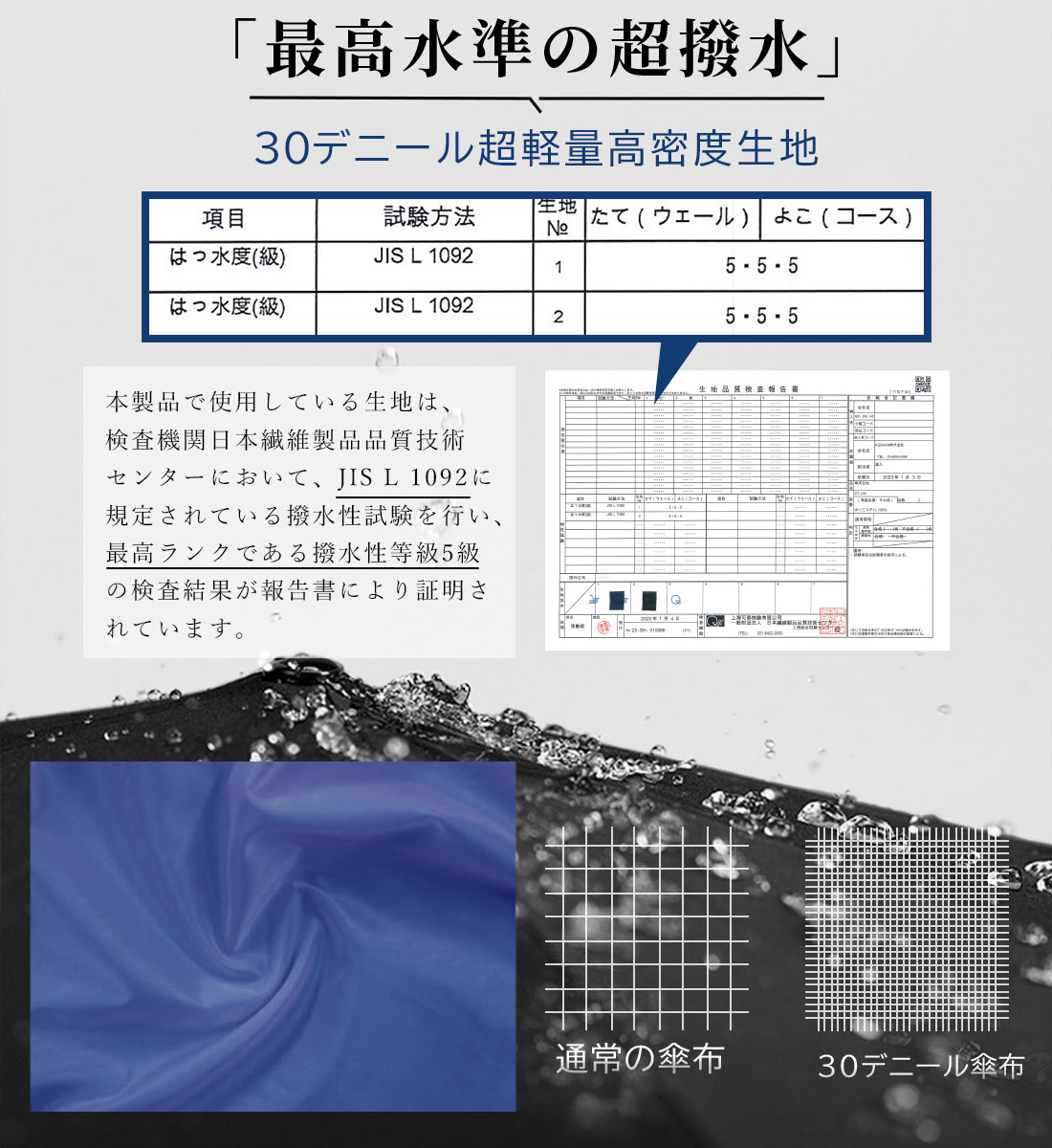 最高ランクの撥水性を誇るポリエステル100%生地は、細く強い糸で織り上げることにより、優れた撥水力を維持しながら薄く軽く改良することが出来ました。