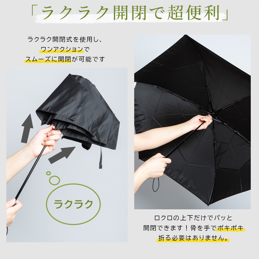 ポキポキ折らず、使いやすさと安全性をしっかりサポート。通勤や買い物の際もワンアクションで素早く開閉できます!