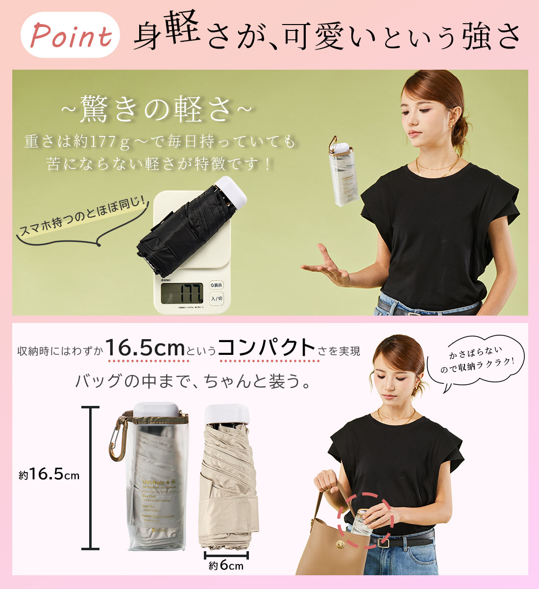 【2026新色】超軽量カーボン日傘 晴雨兼用 6本骨 U.Light~airy+ classic~