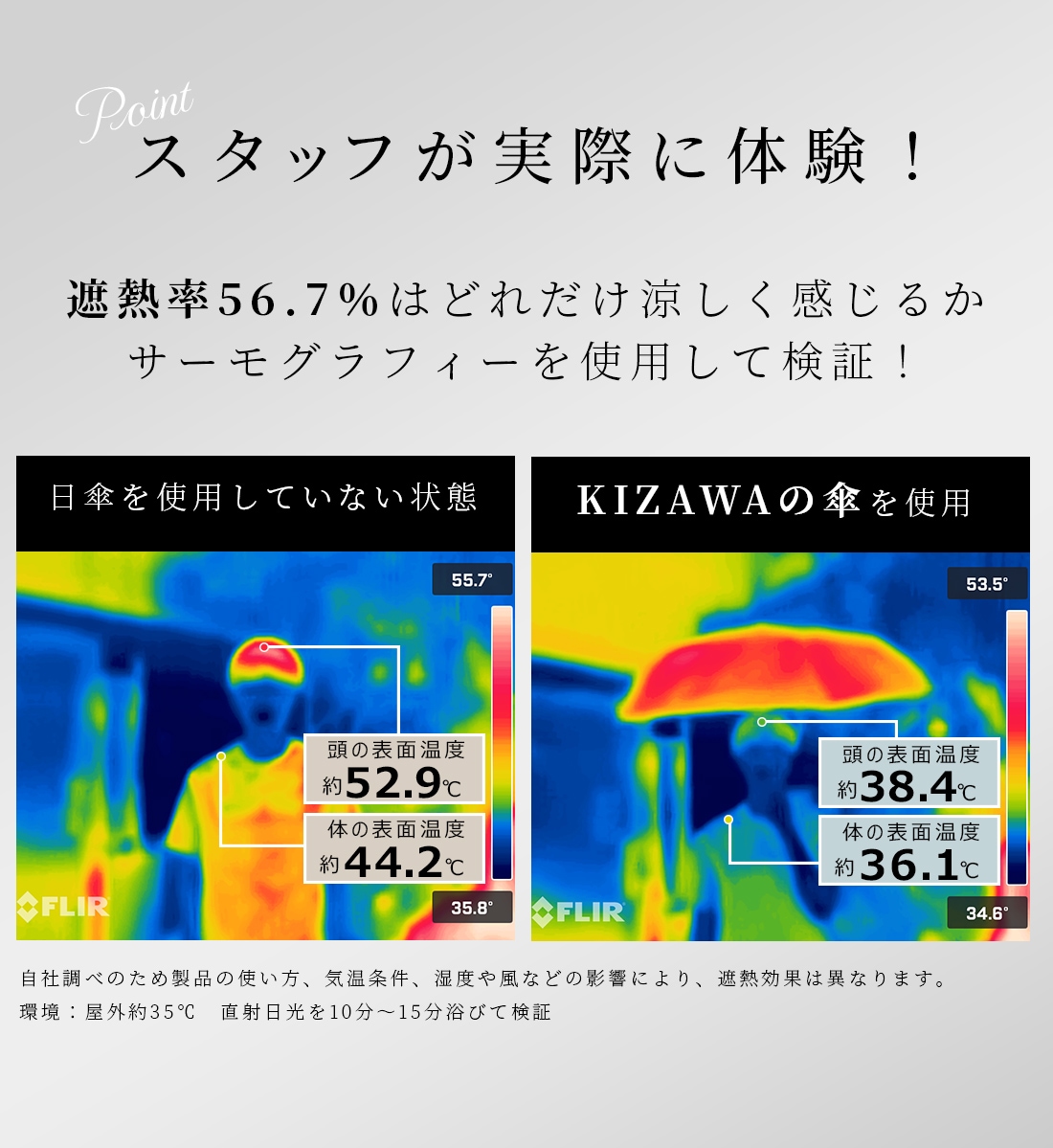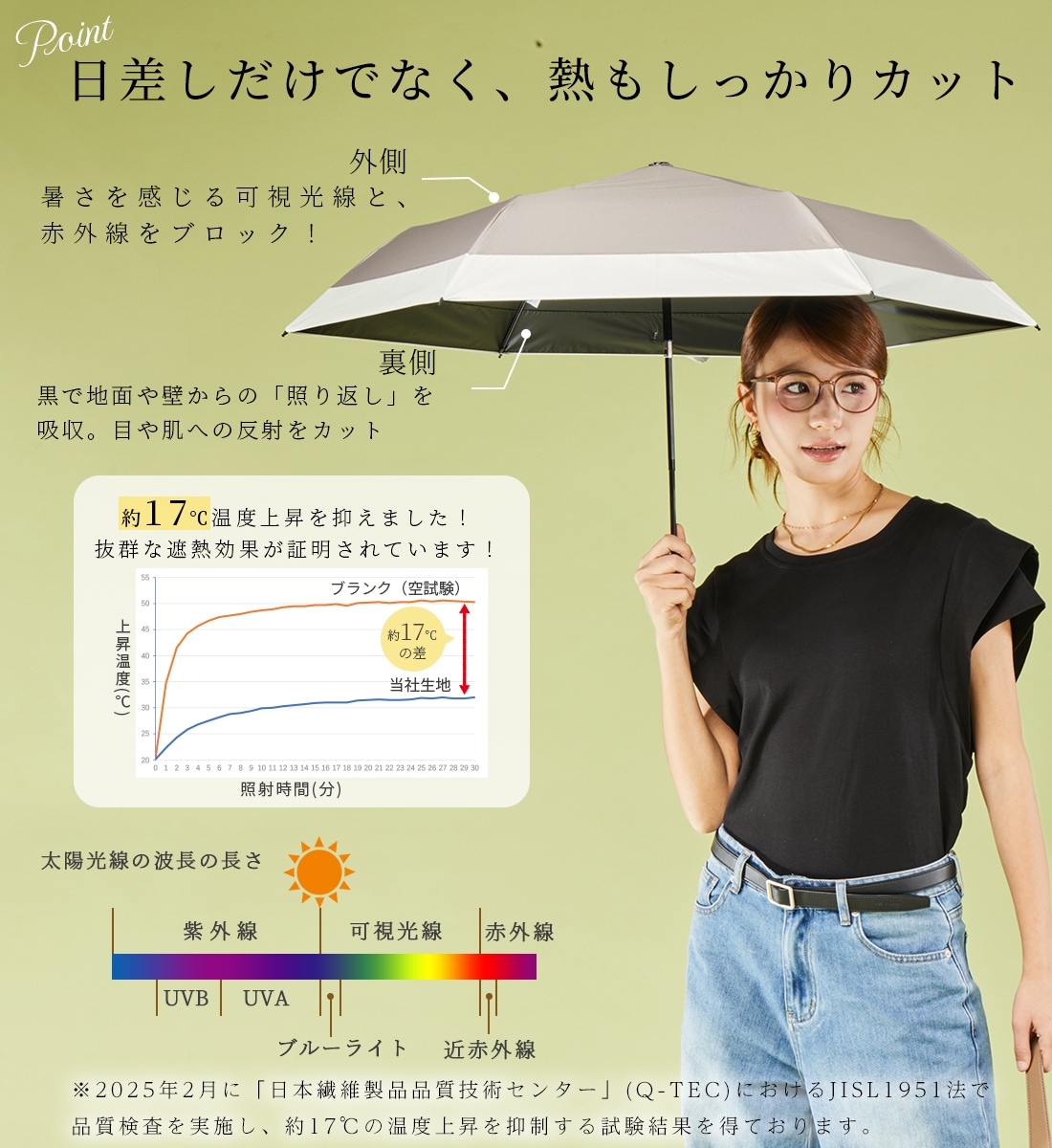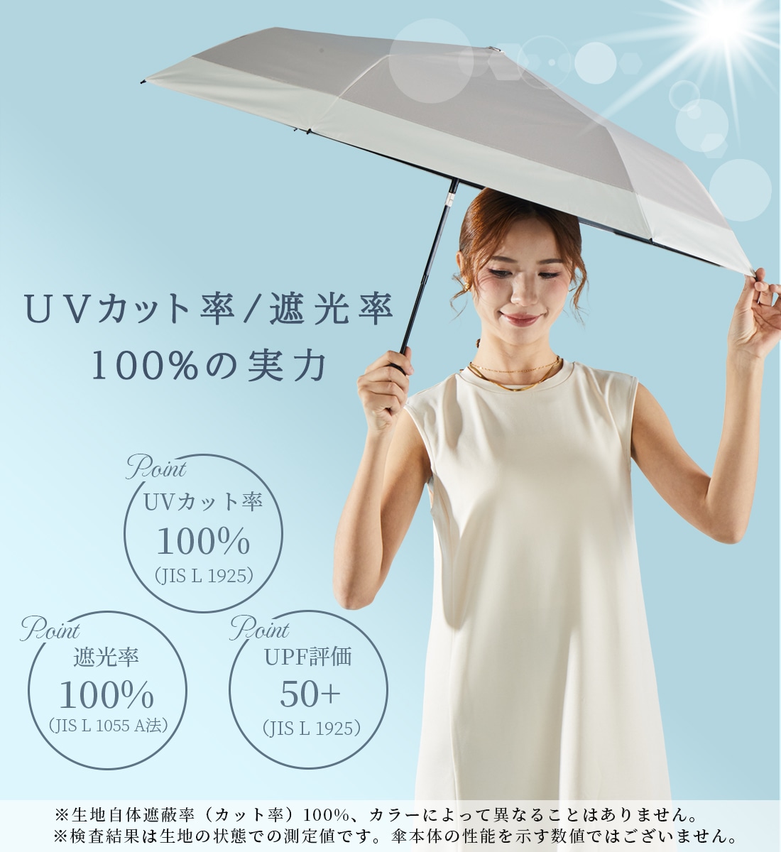 日本繊維製品品質技術センターにおいて「遮光率100%」「UVカット率100%」「UPF50+」「遮熱効果」と証明された最高ランクを誇る高機能な生地を使用した完全遮光の日傘です。