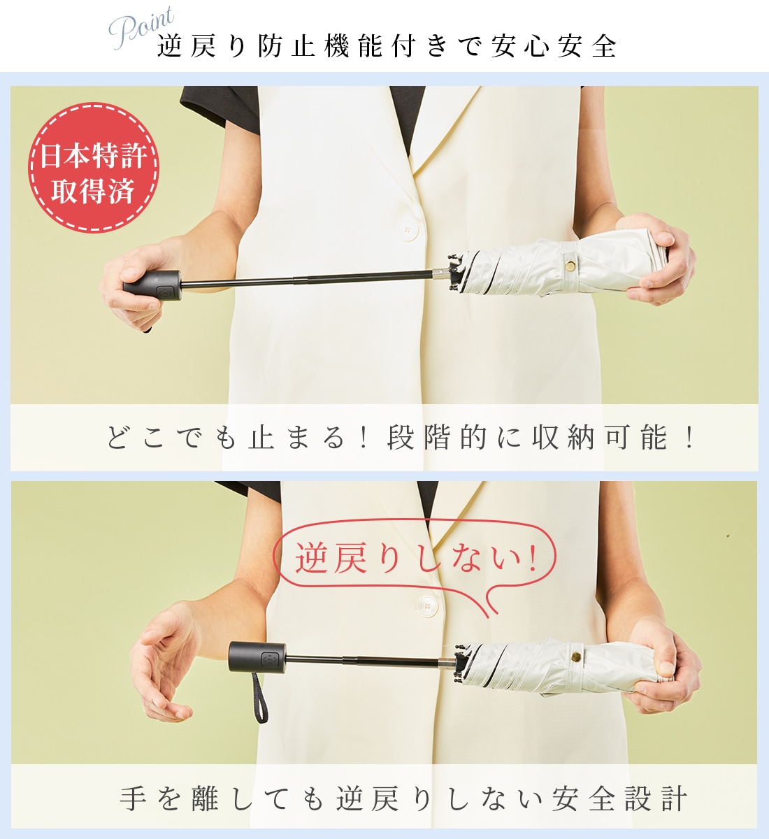 柄を元に戻す際の不意な飛び出しを防ぐセーフティシャフト(日本特許取得済)搭載で、一般的な自動開閉折りたたみ傘より安全に閉じられます。途中で手を放しても安全!中棒が飛び出ることのない安心設計になっています。