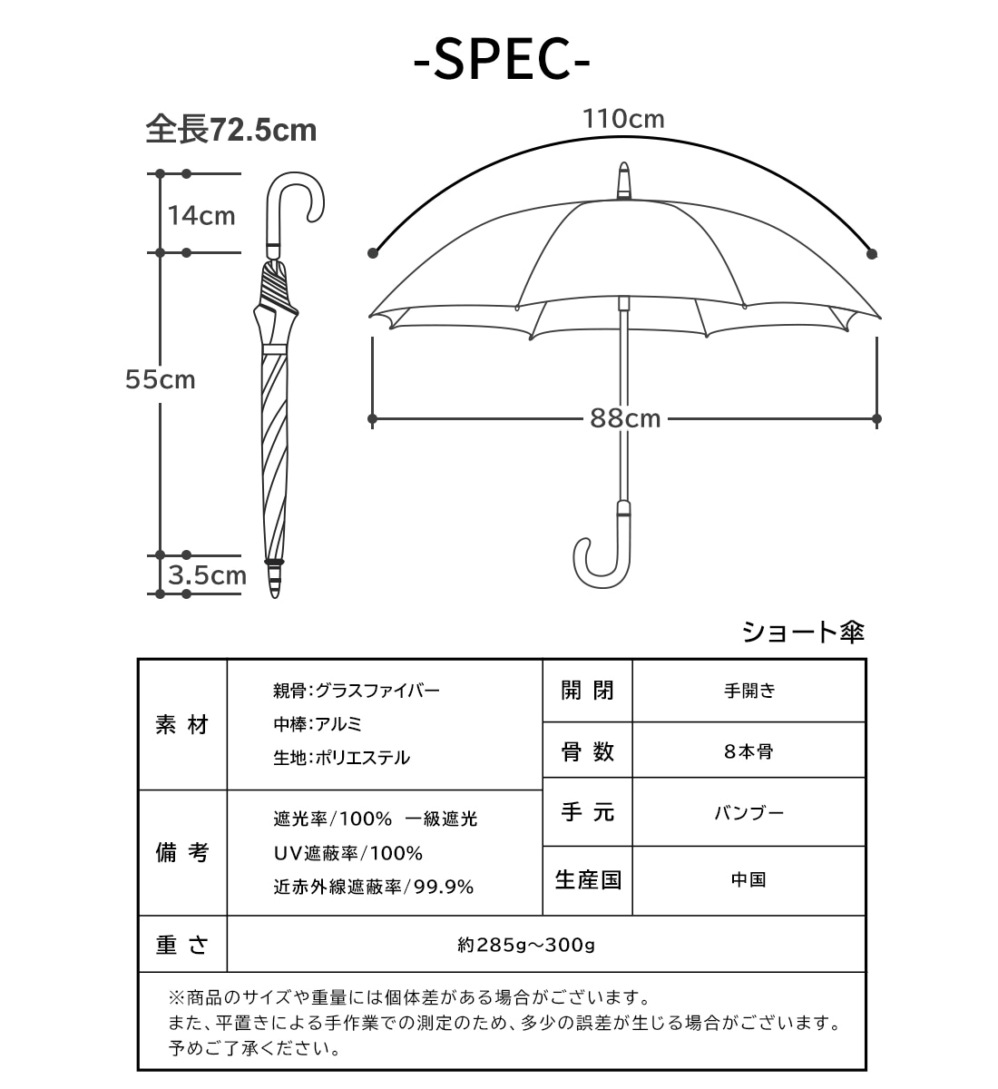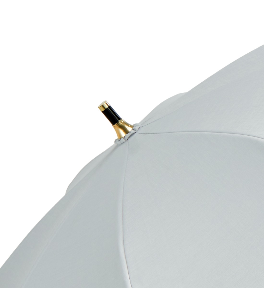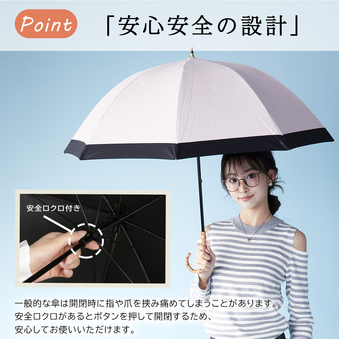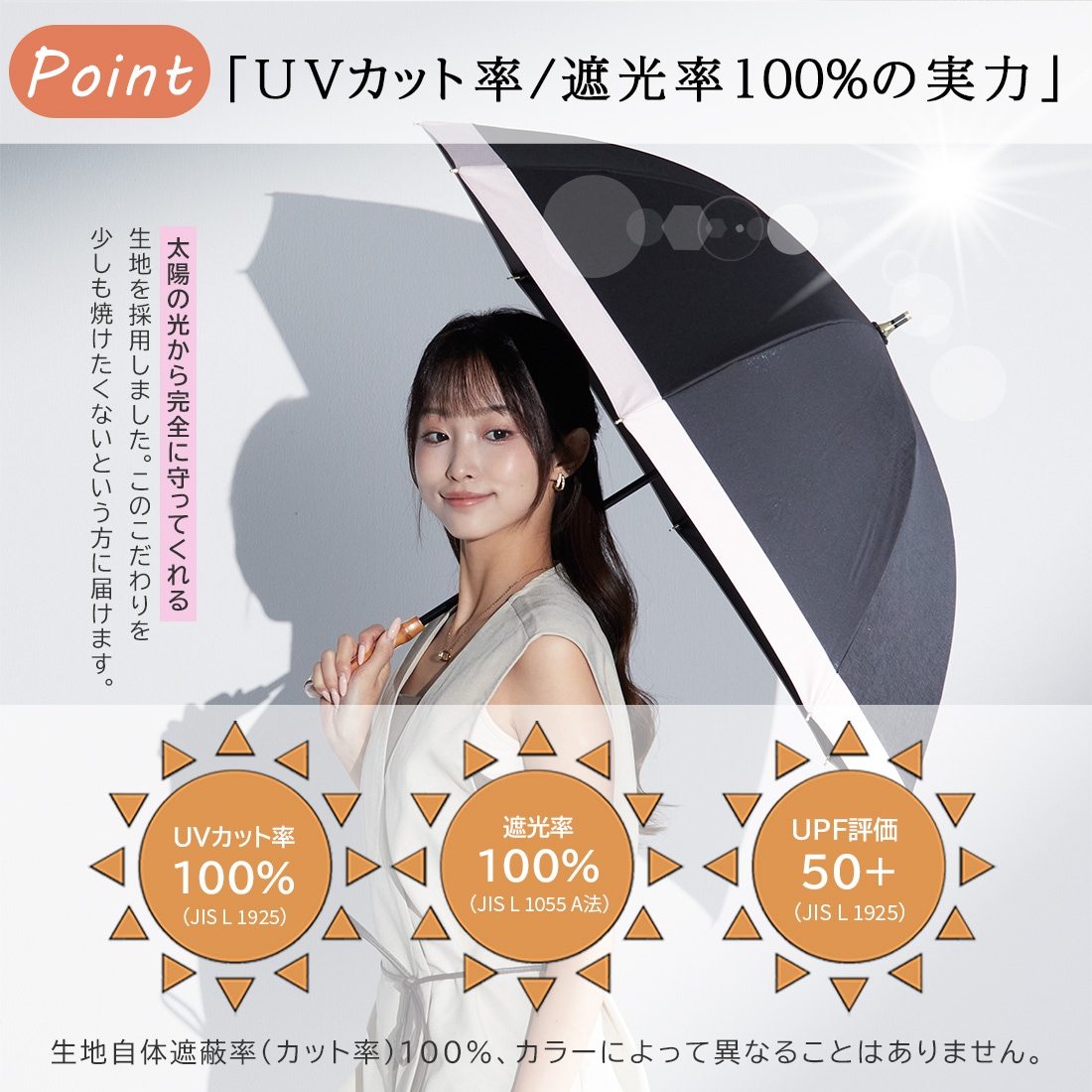 日本繊維製品品質技術センターにおいて「遮光率100%」「UVカット率100%」「UPF50+」「遮熱効果」と証明された最高ランクを誇る高機能な生地を使用した完全遮光の日傘です。